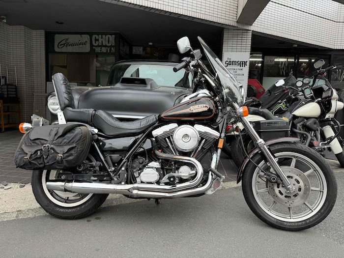 お客様の委託車両。1992年式FXRコンバーチブル。ご覧のようにコンディション良く、一番人気の黒にオレンジと赤のピンスト、全て整備済みのすぐに乗れるFXRです。2年前に輸入をして新規車検を取っておりますので、来年の5月まで車検は残っています。2年前の修理項目お知らせいたします。